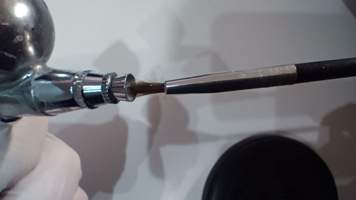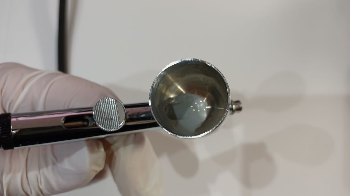2. クリーナーに沈める: 小さな容器にエアブラシクリーナーを満たし、ノズルを漬けます。